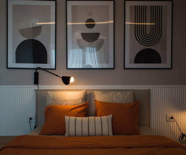 Paleta cromatică pornește de la tonuri neutre – cremuri, griuri calde și nuanțe de lemn –, completate de accente îndrăznețe de albastru și portocaliu. Acestea dinamizează spațiul fără a-i altera calmul. Texturile imperfecte, materialele tactile și luminile atent plasate oferă profunzime și un sentiment de acasă.